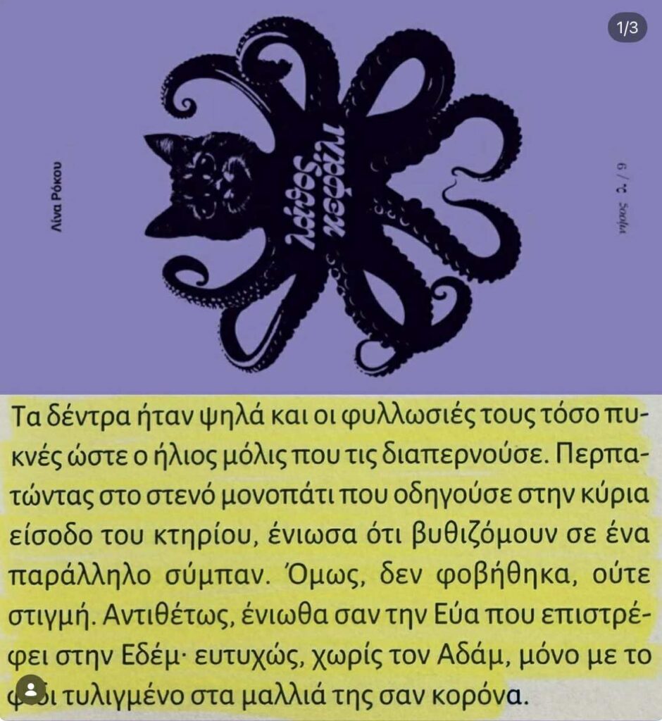 Δε χρειάζεται να γνωρίζετε κάτι άλλο για το στόρι. Έτσι κι αλλιώς η πλοκή δεν παίζει ποτέ ουσιαστικό ρόλο, εύκολα θυμάται κανείς πως τελειώνει το 20.000 λεύγες κάτω από τη θάλασσα, δύσκολα όμως μπορεί να συγκρατήσει το πως ναυάγησαν αρχικά οι 3 (?) φίλοι στο Ναυτίλο, τί περιπέτειες έζησαν μέσα σε αυτόν, τί ακριβώς οδήγησε τον Κάπταιν Νέμο στην απόφασή του να καταστρέψει τον κόσμο. Το ίδιο ακριβώς και με τη @lina_rokou . Οι ήρωες της είναι συμπαθέστατοι, και πολλά μπορεί να πει κανείς για αυτούς αλλά στο τέλος της μέρας το μόνο που θυμάσαι είναι πως σε κάθε σελίδα του βιβλίου της, ξεχωρίζεις κι από έναν μικρό κόκκο του εαυτού σου, είτε μιλάει για την ηρωίδα της, είτε για τον φιρμάτο οικοδεσπότη της, είτε για το ανάποδο ανιαούριστο γατί, εσύ καταπίνεις τις σελίδες της γιατί πολύ απλά το βιβλίο της, το κάθε βιβλίο της, μιλάει για εσένα σε εσένα, σε κοιτάει στα μάτια, και σου απευθύνει ερωτήσεις, τις οποίες θέλοντας και μη απαντάς, όχι σε εκείνη, αυτό κυριολεκτικά θα ήταν το πιό εύκολο, αλλά στον ίδιο σου τον εαυτό, περνάς στην άλλη μεριά του καθρέφτη σου και αντικρύζεις τον ίδιο σου το είναι όπως ακριβώς και όλοι οι άλλοι, δεν τα λύνεις όλα με ένα από duckface και ένα κλείσιμο ματιού, ο Γόρδιος Δεσμός σου, βγαίνει στο προσκήνιο, και σπαθί δεν υπάρχει κάπου κοντά σου.