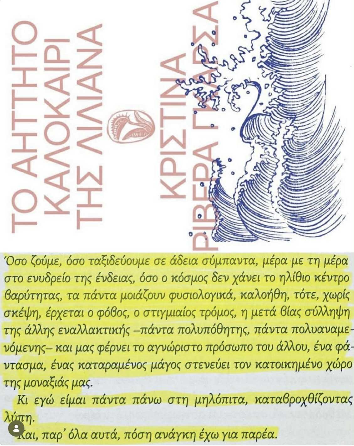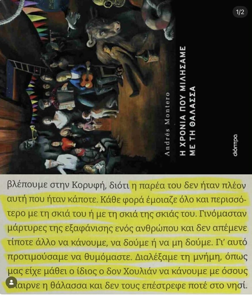 Συνεχίζοντας το εντυπωσιακό μην πω θριαμβευτικό κλείσιμο που είχε το 2025 δε μπορώ να μη μιλήσω για αυτό το μικρό αριστούργημα που όπως είπε τη μέρα που το καταχώνιασε στην τσάντα μου ο Αλέξανδρος από τον Πολύγραφο, «αυτό είναι για σένα, γράφει το όνομά σου, μην το συζητάς, μυρίζει». Εγώ όταν το λέει αυτό, πάντα πηγαίνει το μυαλό μου σε ένα εορταστικό επεισόδιο των Απαράδεκτων από την πρωτοχρονιά του 1999 όπου σε ένα πάρτι έρχεται ένας τύπος και την πέφτει στη Δήμητρα λέγοντάς της «όποιος γυρίζει, μυρίζει» αναφερόμενος στο ότι κανείς δε θα μπορούσε να προσπεράσει την ομορφιά της, για να του απαντήσει εκείνη με τη σειρά της «ναι, και εσύ όπως φαίνεται γυρίζεις πολύ». Τέλος πάντως, καθένας με το νταλκά του, στιγμές στιγμές μου λείπουν εκείνα τα εορταστικά επεισόδια των σειρών στο MEGA, που τα βλέπαμε όλοι καρφωμένοι στις τηλεοράσεις μας, χωρίς να έχουμε στα χέρια μας κινητά, χωρίς να μας περιμένει κανείς να κάνουμε κάτι περιμένοντας να αλλάξει η χρονιά απαλλαγμένοι από υποχρεώσεις, δε δουλεύαμε ούτε Σάββατα αλλά ούτε και Δευτέρες, ήμασταν σε ένα καφέ με τους φίλους μας και τους καρφώναμε στα μάτια, στραγγίζοντάς τους από κάθε πιθανή πληροφορία για τα πάντα. Μια φορά μάλιστα με είχε ρωτήσει και μια φορά ο πατέρας μου «παιδί μου, τί λέτε με τους φίλους σου τόσα χρόνια κάθε βράδυ» και ΑΥΤΟ ΑΚΡΙΒΩΣ κόλλησε στο μυαλό μου από την πρώτη σελίδα της «Χρονιάς που μιλήσαμε με τη θάλασσα» το οποίο αν με ρωτάτε, ΝΑΙ ΕΝΝΟΕΙΤΑΙ ήταν πλημμυρισμένο με τις ευωδιές ενός χωριού αποκλεισμένου από τον κόσμο εξαιτίας ενός μοναδικού φαινομένου, με ανθρώπους που ναι μπορεί να μην έφυγαν ποτέ από αυτό, οι φωνές τους και τα βήματά τους όμως είναι αυτά που το κρατάνε σφριγηλά στη ζωή.