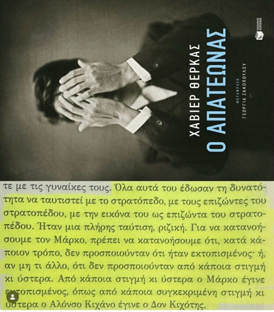 Εννοείται και δεν γνώριζα το παραμικρό για την Αληθινή Ιστορία που συντάραξε πριν καμία 20αριά χρόνια την Ισπανία, ο Μάρκο κατάφερε για κοντά 60 χρόνια και έζησε μία ζωή στα όρια του μύθου, όπου όλοι του συμπεριφέρονταν σα να είναι ένας πραγματικός ήρωας όμως ο ίδιος δεν έζησε το παραμικρό από όσα για χρόνια είχε πείσει τους άλλους αλλά και τον εαυτό του πως είχε ζήσει. Και χωρίς να σας δώσω spoiler για τα ασύλληπτα ψέματα που είπε θα μεταφέρω το φακό του ενδιαφέροντος μου στον συγγραφέα. Δεν είχα ξαναδιαβάζει κείμενο του Θερκάς, αλλά νομίζω πως είχα πάνω από 10 χρόνια να νοιώσω ταραχή διαβάζοντας επιτέλους λέξεις που τις χαρακτηρίζει ιδιαίτερο προσωπικό στυλ! Είχα από τον Καμπρέ και την Μπάγηατ να αισθανθώ πως αυτή η ιστορία έχει δουλευτεί σε ένα ξεχωριστό εργοστάσιο ιστοριών, σαν εκείνα της Apple που πριν μπεις παραδίδεις στην είσοδο τα προσωπικά σου αντικείμενα, και δεν έχεις δικαίωμα καν να πεις μία ιστορία από όσα έζησες μέσα σε αυτό. Όλο του το αφηγηματικό στυλ είναι ειλικρινά τόσο θελκτικό στον αναγνώστη, που ενώ διαβάζεις μία ιστορία που από την πρώτη της σελίδα του λέει ακριβώς το τί έχει συμβεί και δεν έχεις να περιμένεις μία μεγάλη ανατροπή, τελειώνεις μετά από μέρες το κείμενο σα να μην κατάλαβες πως γυρνούσαν οι σελίδες η μία πίσω από την άλλη, χωρίς στιγμή να κουραστείς, χωρίς στιγμή να πλήξεις. Με μία ερώτηση που από τη στιγμή που αποτυπώθηκε στο μυαλό μου δεν έσβησε ποτέ. «Πόσο κακό έκανε τελικά ένας άνθρωπος που μιλούσε 50 και πλέον χρόνια δημόσια ενάντια στη Ναζιστική Θηριωδία, χωρίς όμως να υπήρξε στιγμή θύμα της».