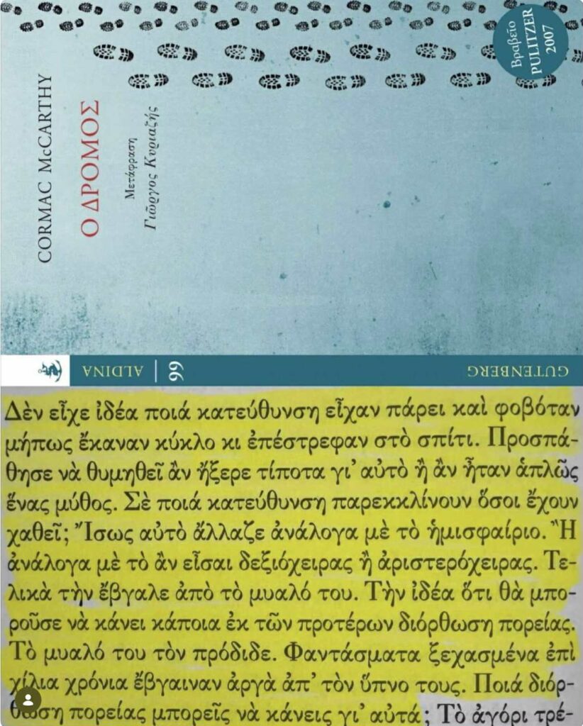 Για τον Κόρμακ Μακάρθι έχω ξαναγράψει, ο Ματωμένος Μεσημβρινός του που μόλις πέρσι επανακυκλοφόρησε από τις εκδόσεις Gutenberg καρφώθηκε εν μια νυκτί στη λίστα με τα 10 καλύτερα βιβλία που έχω ποτέ διαβάσει, και «ο Δρόμος» του δε θα μπορούσε να μην ξεχειλίζει με λέξεις, προτάσεις και εικόνες μαεστρικά διαλεγμένες και αποτυπωμένες στο χαρτί, είναι πραγματικά συγκλονιστικός ο τρόπος που γράφει, δεν τον συναντάς εύκολα πουθενά πιά, συγγραφείς σαν και αυτόν μοιάζουν κυριολεκτικά να έχουν εκλείψει και ειλικρινά ώρες και στιγμές σκέφτομαι πως ένας αναγνώστης που πιάνει για πρώτη φορά ένα κείμενό του μπορεί να το διαβάσει χωρίς να νοιώσει μέσα του να εκρήγνυται ένας δυναμίτης που του καταβαραθρώνει την αναγνωστική ύπαρξη. Σκληροτράχηλοι χαρακτήρες, σπαρακτικές εικόνες, και κόσμοι πλημμυρισμένοι με εφιαλτικούς χαρακτήρες ανθρώπινων όντων που ενδιαφέρονται για ένα μονάχα πράγμα, την επιβίωσή ΤΟΥΣ αγνοώντας την ύπαρξη όλων των υπολοίπων. Στόχος είναι το επόμενο βήμα, το επόμενο γεύμα, η νέα μέρα που ονομαστικά (για όσους μετράνε ακόμα) και μόνο θα ξημερώσει.