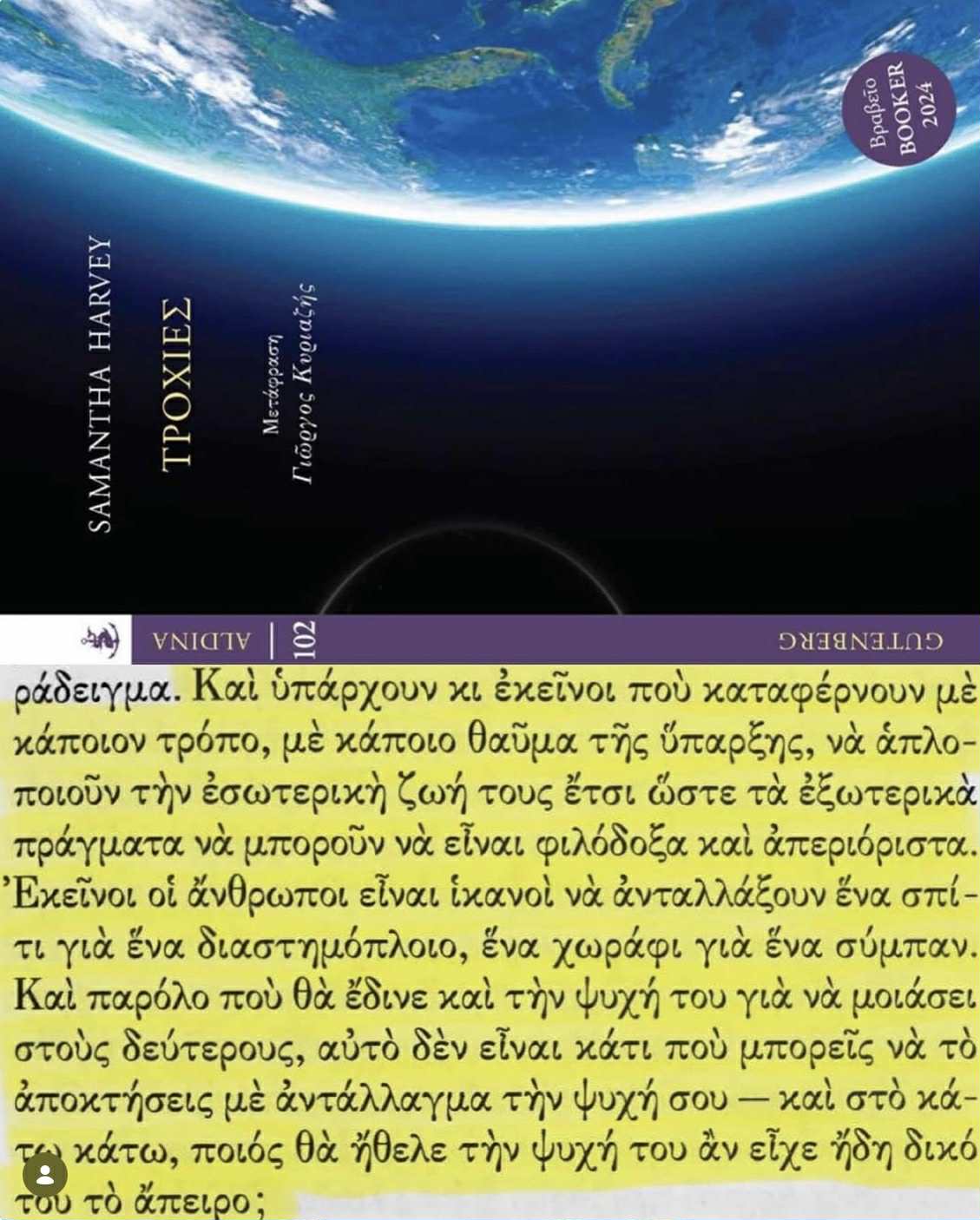 Στις βραβευμένες με Booker “’Tροχιές”, οι άνθρωποι δε μπορούν να κάνουν τίποτε άλλο από το να παρατηρούν. Σε μία σκηνή του βιβλίου, ένας τυφώνας ετοιμάζεται να χτυπήσει ένα ψαροχώρι της ανατολής, και ο αστροναύτης αναρωτιέται τί να κάνει ο φτωχός εκείνος άνθρωπος που τον είχε πρόθυμα και με αγάπη φιλοξενήσει εκεί σε μία καλύβα που ήταν από καιρό έτοιμη να πέσει φτιαγμένη από καλάμια και δεμένη με χόρτα, και γιατί δεν πήρε τότε το τήλέφωνό του ανθρώπου εκείνου ώστε να μπορεί σήμερα να τον ενημερώσει για το τί έρχεται κατά πάνω του, μετά βέβαια θυμάται πως στο ψαροχώρι δεν υπάρχουν τηλεφωνικές γραμμές, και δεν θα είχε καν νόημα να πει τίποτα και σε κανέναν, ότι είναι να γίνει θα γίνει ότι και να γίνει, η φύση θα ακολουθήσει το δρόμο της χωρίς να λογοδοτήσει σε κανέναν, και πως ο ίδιος το μόνο που μπορεί να κάνει είναι να κοιτάζει ανήμπορος ένα λευκό σύννεφο το οποίο θα κινείται απειλητικά καταστρέφοντας τα πάντα μέχρις ότου γίνει ατμός. Άραγε δεν είμαστε και εμείς το ίδιο; Αντιδράμε, θυμώνουμε, τα κάνουμε όλα σώπατο, θρύψαλα, και στο τέλος που τα πάντα ξεχνιούνται, γιατί ας μη γελιόμαστε στο πέρασμα του χρόνου όλα ξεχνιούνται, ένα σύννεφο το ίδιο με εκείνο της υπέρτατης καταστροφής καλύπτει τις πράξεις μας, το ίδιο το σύννεφο που αυτή τη φορά έχει το όνομα της λήθης, και όλα περνάνε, και όλα εξαφανίζονται από τη μνήμη μας θυμόμαστε μία κάποια version που μας βολεύει στο να κοιμόμαστε το βράδυ, και ακόμα και αν τίποτα δεν είναι πια το ίδιο, η ζωή απλά συνεχίζεται, μέχρι τον επόμενο μουσώνα, μέχρι τον επόμενο τυφώνα, μέχρι το επόμενο ψιλόβροχο.